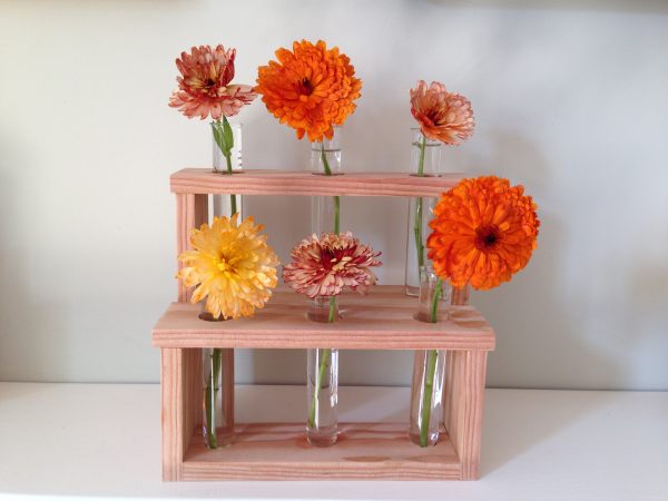 My version (top image) uses boiling tubes to create a more petite rack that sits happily on a shelf – it can hold three large stems or 6 smaller stems at a time. It’s made from douglas fir and with time and use it will age to a nice deep colour