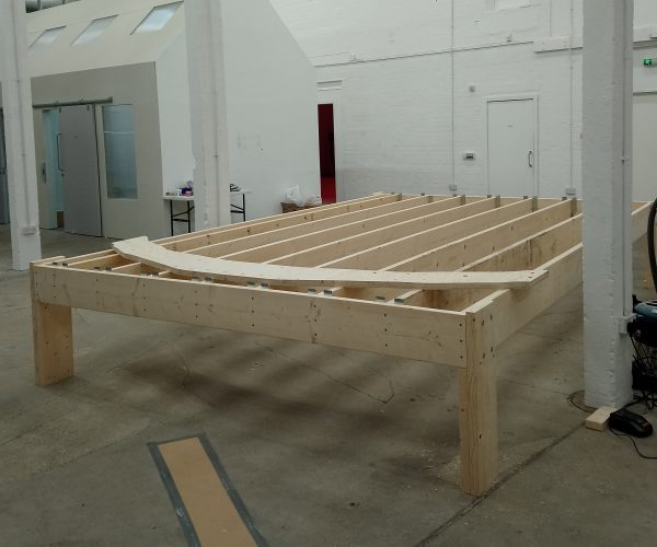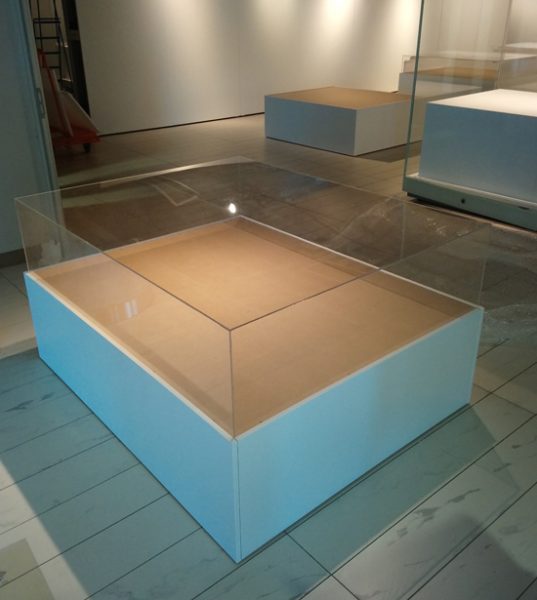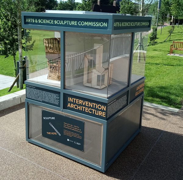 Design, fabrication and installation of a bespoke display case for showing maquettes outdoors over a long period of time. The case has an aluminium frame, glazed with tough polycarbonate. The roof is centrally draining (to protect against rain) and the case is installed with solar power to provide internal lighting at night. The case was installed in the University of Birmingham’s new Green Heart, a green oasis in the heart of campus. Four shortlisted artists for The University of Birmingham Arts & Science Commission showed models of their work in the display case, coinciding with a public vote to choose the winning sculpture design.