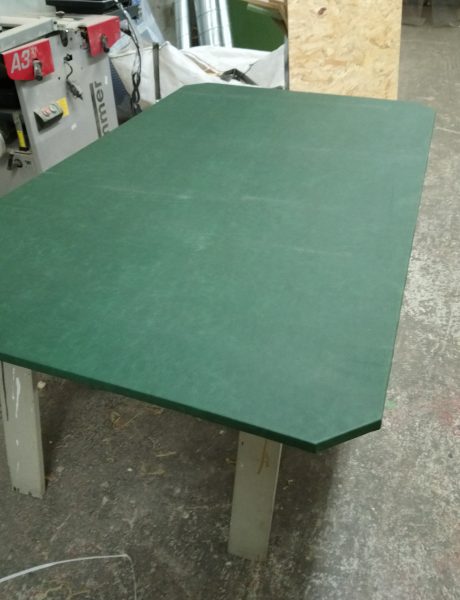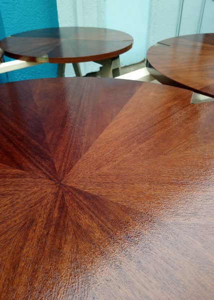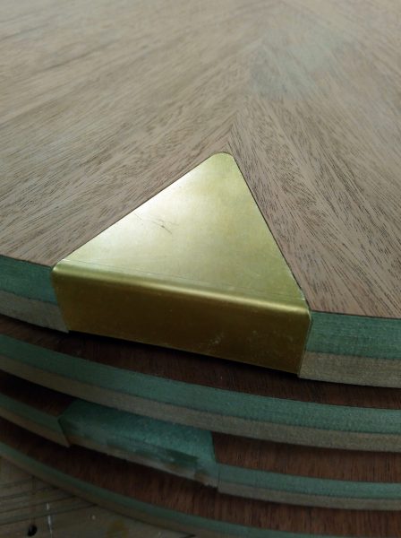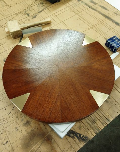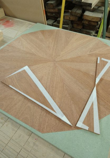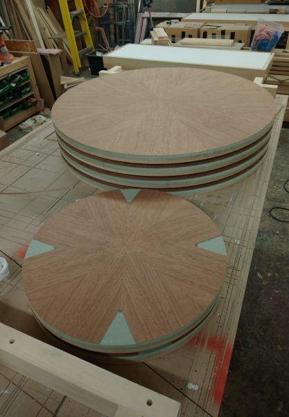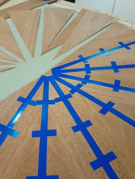 The process of veneering 6 bespoke table tops, using a 16-segment sunburst pattern and brass infils.